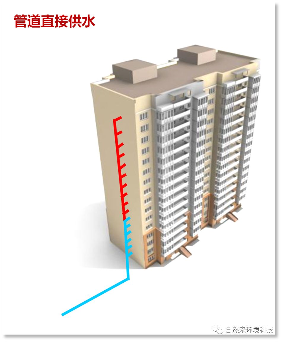 这种方式是依靠市政管网的水压直接将水送到用户家里,但是因为水压的限制,一般是6层以下建筑才能保证正常供水。同时,这种方式的供水一旦遇到管网停水,用户室内也立即断水。所以,这种形式虽然简便又安全,但也有美中不足之处。