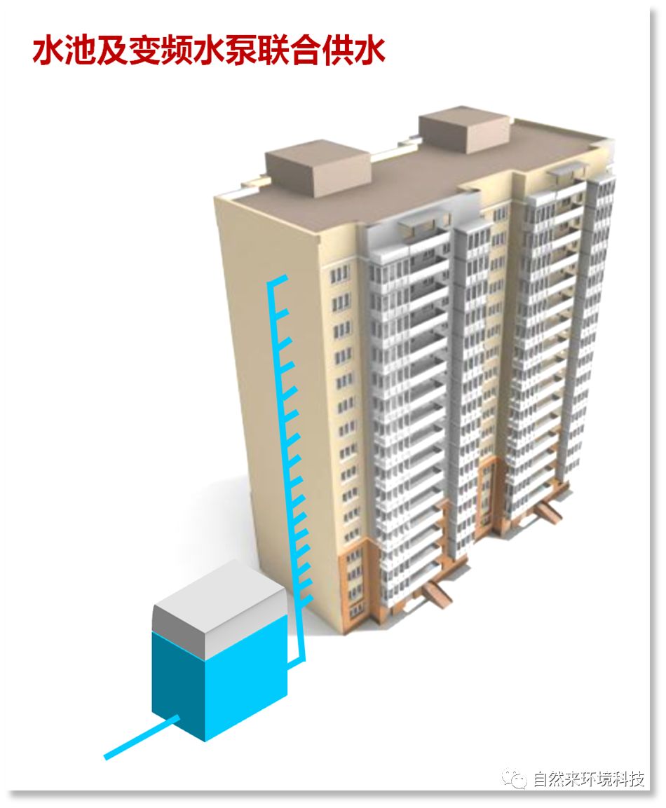 这种方式避免了在楼顶设置水箱,改为在地面设置水池,配合水泵加压供水。虽然楼顶不用造水箱了,但是依然要保证供水到最高楼层,所以这种方式的弊端在于设备要求高,相应的成本也较高。