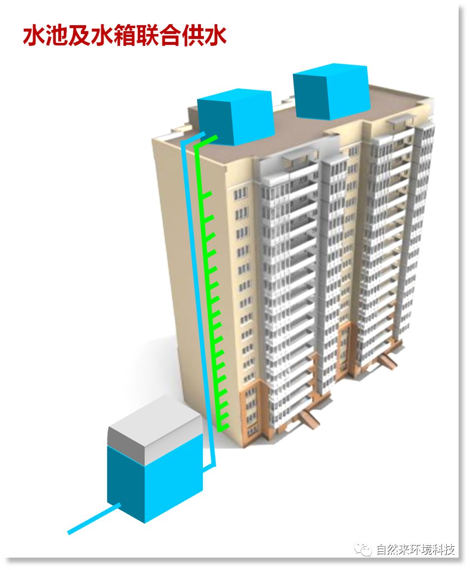 这种方式避免了在楼顶设置水箱,改为在地面设置水池,配合水泵加压供水。虽然楼顶不用造水箱了,但是依然要保证供水到最高楼层,所以这种方式的弊端在于设备要求高,相应的成本也较高。